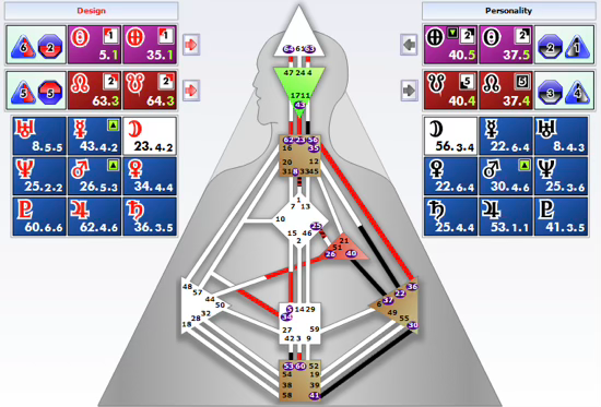 Both the Sun/Earth axis and the lunar nodes are positioned around themes of negotiation, agreements, and the possibility of fair outcomes between parties. Yet the chart suggests the potential for “jumping the gun” — quite literally — through an unconscious emotional definition between the Solar Plexus and the Throat center. What manifests is a tone of deconstruction, coded in the 23rd Gate (4th line) as “fatalism, egoism, and damn the consequences.” The Moon in the 56th Gate (3rd line), also in the Throat, carries the theme of “wanting to be the center of expression.”